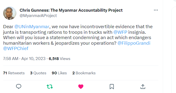 Disturbingly, the news of the Myanmar-based UN agencies including the World Food Programme (WFP) providing Min Aung Hlaing’s Ministry of Defence with the vehicles and vassals marked “UN” – either concealed or openly – carrying the military personnel across the borders to Bangladesh refugee camps and UN-provisions of food to the frontlines.