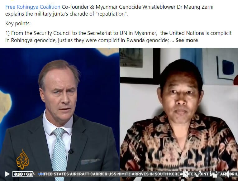 - Maung Zarni explains the military junta’s charade of China-brokered “pilot repatriation” of 1,000 out of 1 million Rohingyas, Al Jazeera English, 29 March 2023.