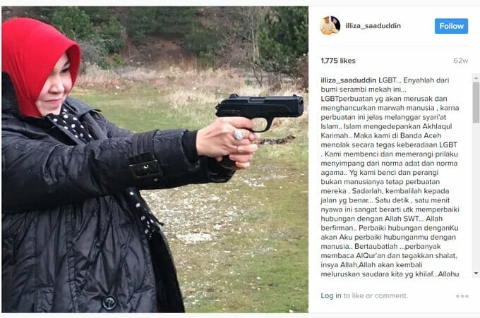 Religious and political authorities have long incited hatred against members of the LGBT community. In 2012 for instance, Illiza Saaduddin, at the time the deputy mayor of the province’s capital, Banda Aceh, posted a picture of herself on Instagram holding a handgun with both hands, and declaring that LGBT people ruin the dignity of humankind. ‘We in Aceh’, she asserted, ‘hate them and fight against their behaviour which violates our customary norms and religion’.