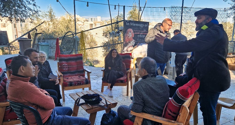 The community centre, Issa Amro and his band of resisters, both men and women, atop hill overlooking Hebron City, 200 metres away from the nearest Israeli occupation checkpoint. Photo by Zarni, Jan. 2025