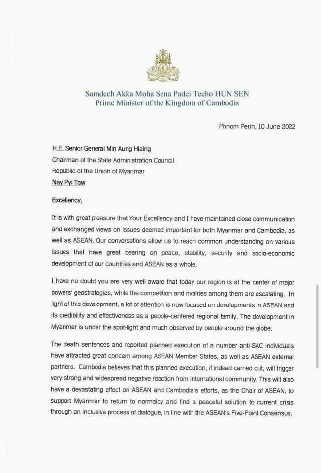 The junta leadership disregarded appeals for stay even from its friends within the Association of South East Asia (ASEAN), specifically Cambodian Prime Minister Hun Sen who has put his political credibility on the line, pushing for the continued embrace of the genocidal regime as part of “the family”.