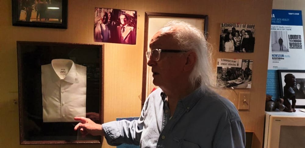 Jack showing me one of his treasures, a shirt gifted to him by the late (1974) Nobel Peace Laureate Sean MacBride, chief of staff of the IRA, External Affairs Minister of Ireland, who founded or participated in many international organizations including the United Nations and Amnesty International, in the basement of his Washington DC home, June 2019.