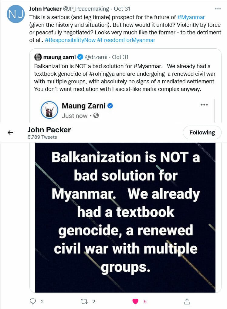 On 31 October, John Packer, the University of Ottawa law professor in international conflict resolution, chimed in with a tweet: “This (Myanmar Balkanizing) is a serious (and legitimate) prospect for the future of #Myanmar (given the history and situation). But how would it unfold? Violently by force or peacefully negotiated? Looks very much like the former – to the detriment of all. #ResponsibilityNow #FreedomForMyanmar”.